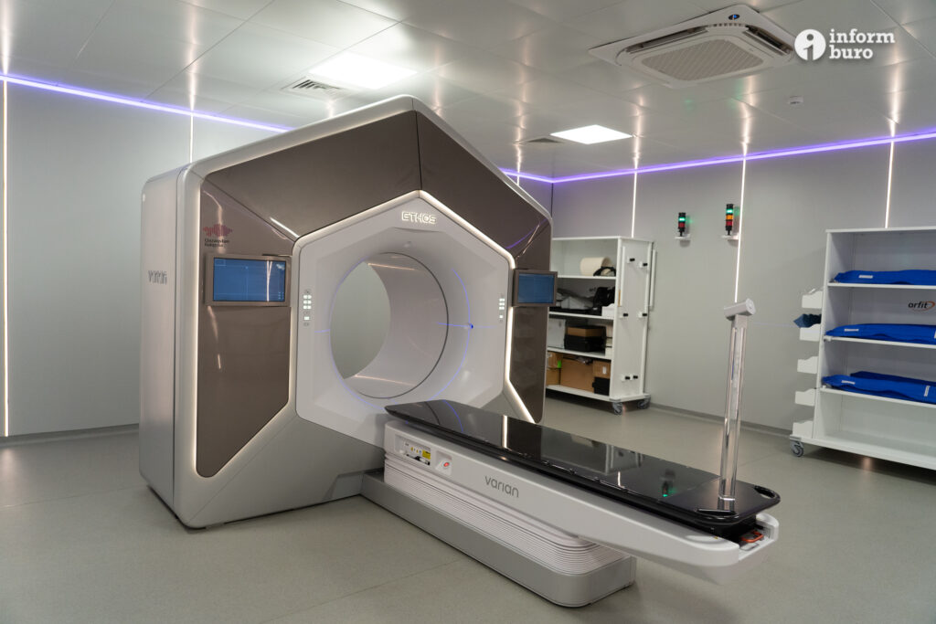 «Это последнее поколение. Выполняет абсолютно все функции, имеет элементы ИИ. На нём мы можем также лечить, как мы говорим, от макушек до пяток. Все виды локализации. И детей, и взрослых. Большая пропускная способность. Работает у нас по 8-12 часов. Здесь также открытый КТ, система визуализации, движение стола 6D, все позиции», – рассказал Ким.
